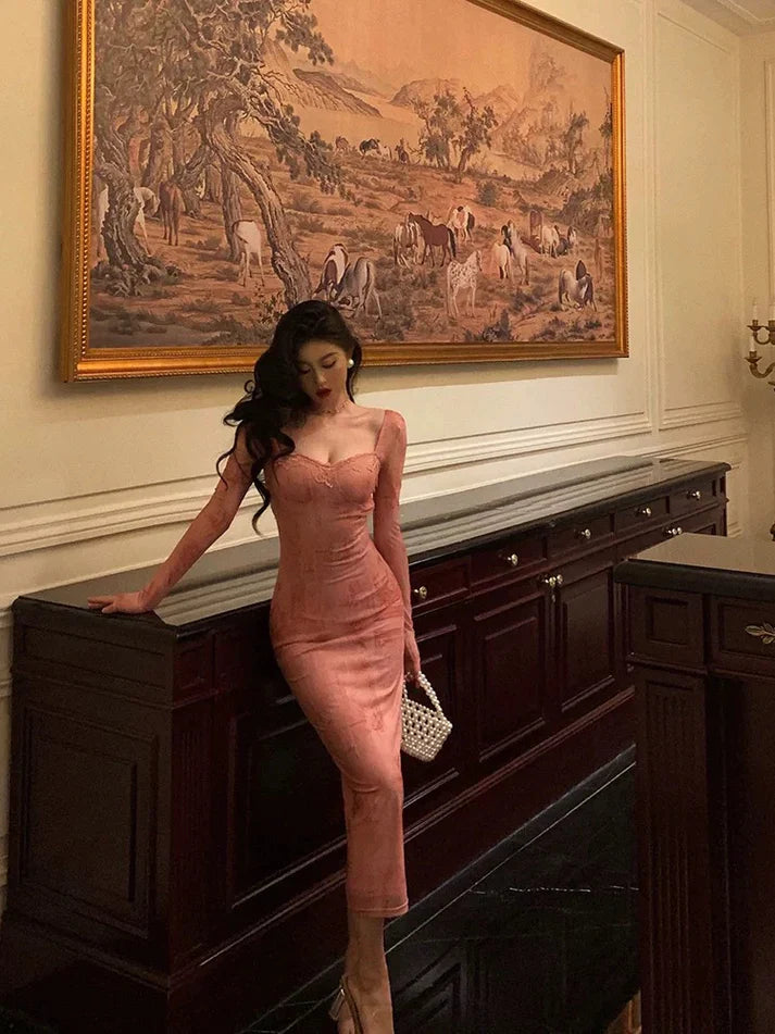 Gorgeous Sheath Square Neckline Long Sleeves Pink Lace Date Night Dress Long Prom Dresses Birthday Outfits, HZ0307
