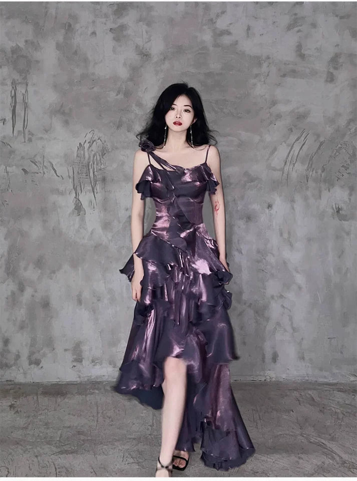 Pretty Irregular Ruffled Spaghetti Straps Grape Prom Dresses With Detachable Rose Long Birthday Dress For Women, HZ0307