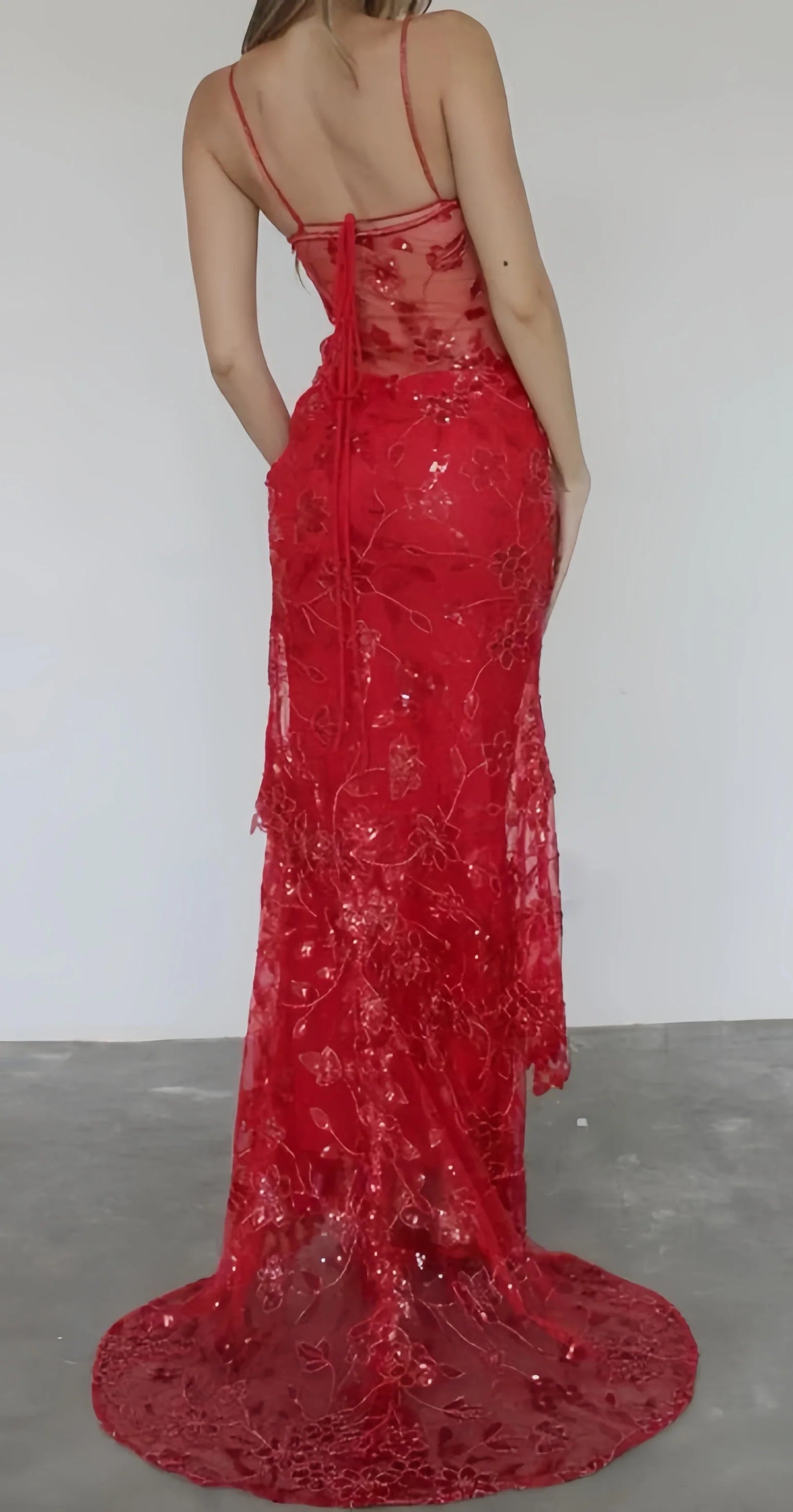Sexy Red Lace Mermaid Long Prom Dresses Spaghetti Straps Evening Formal HZ0307