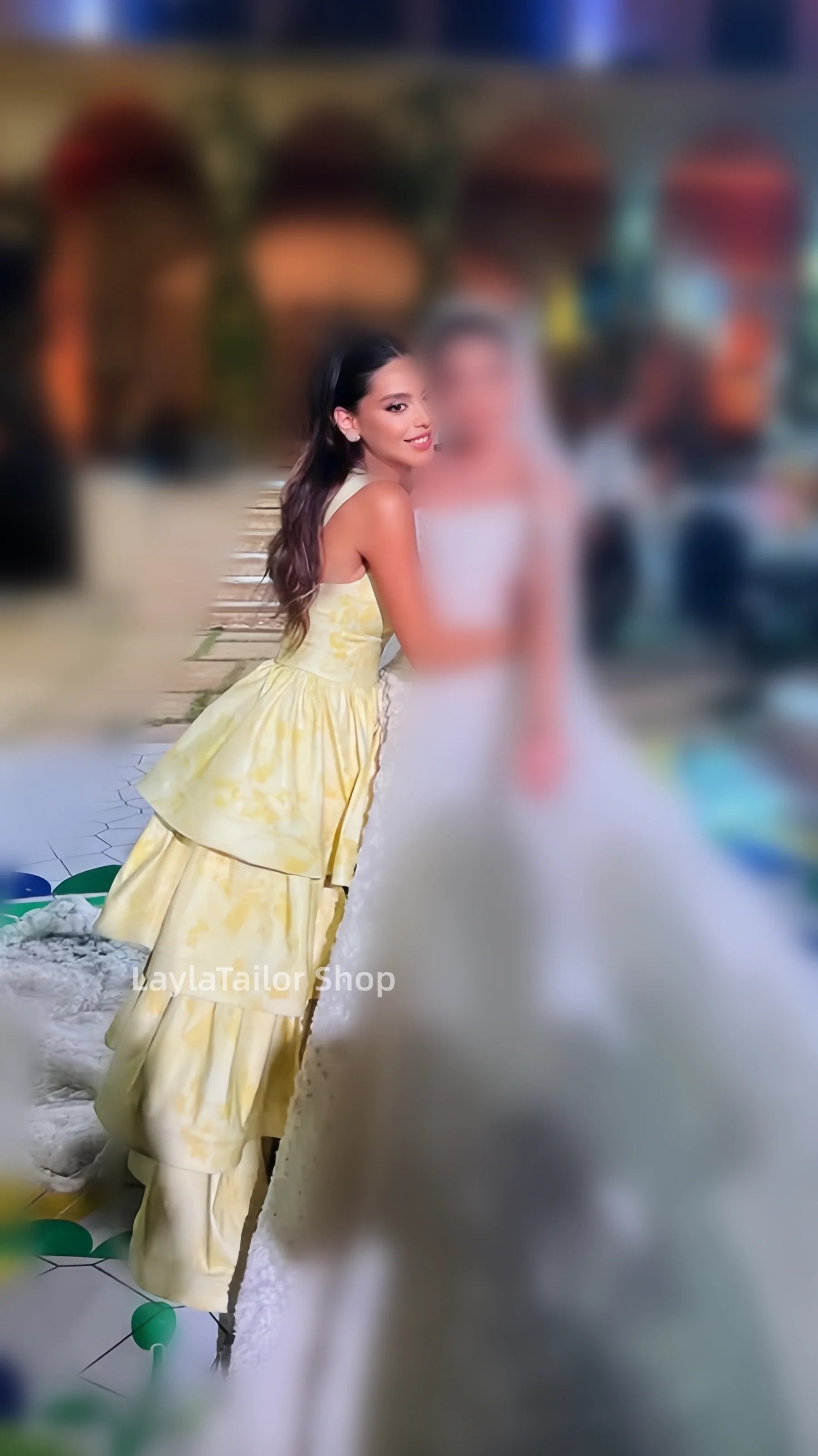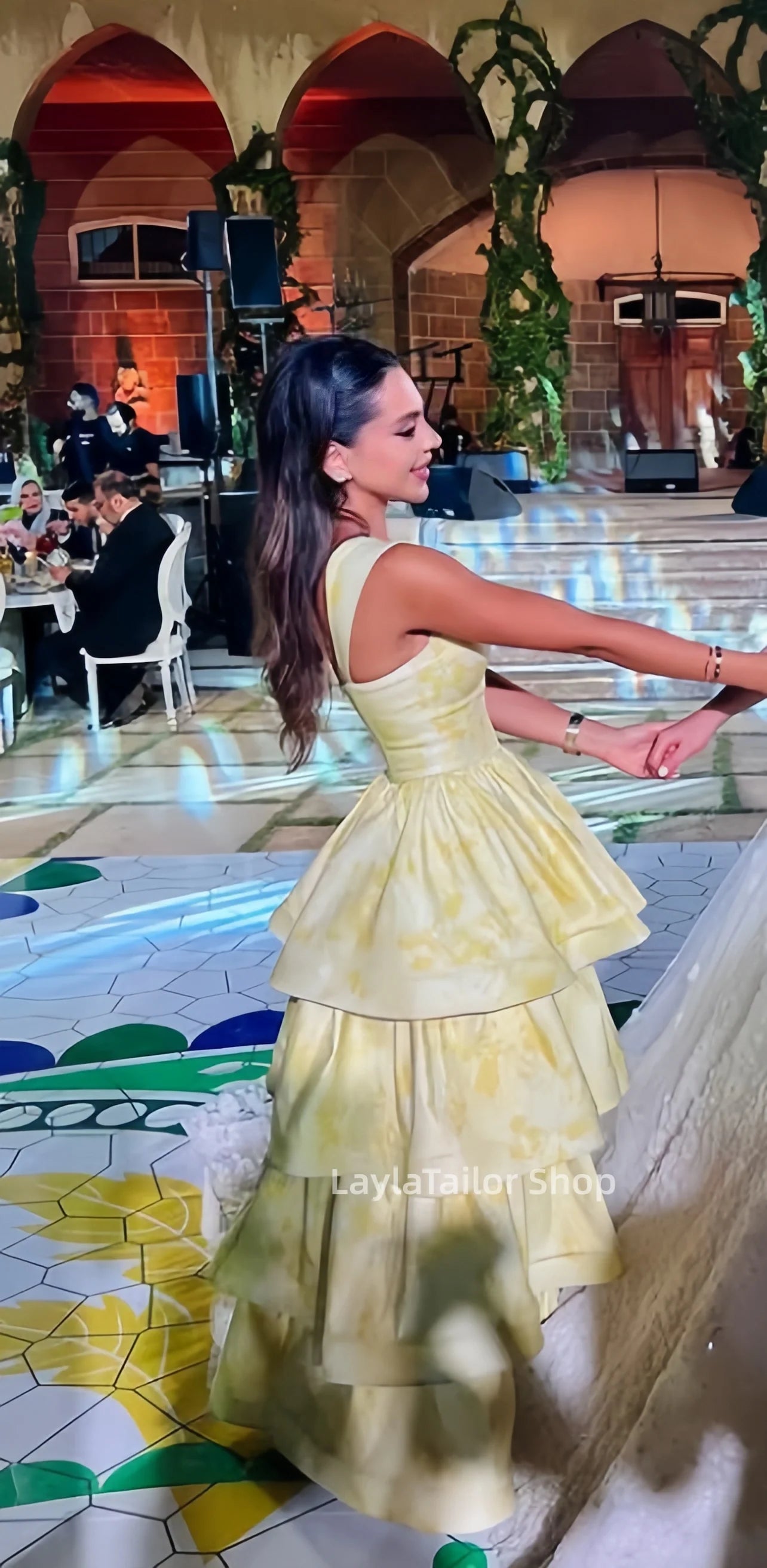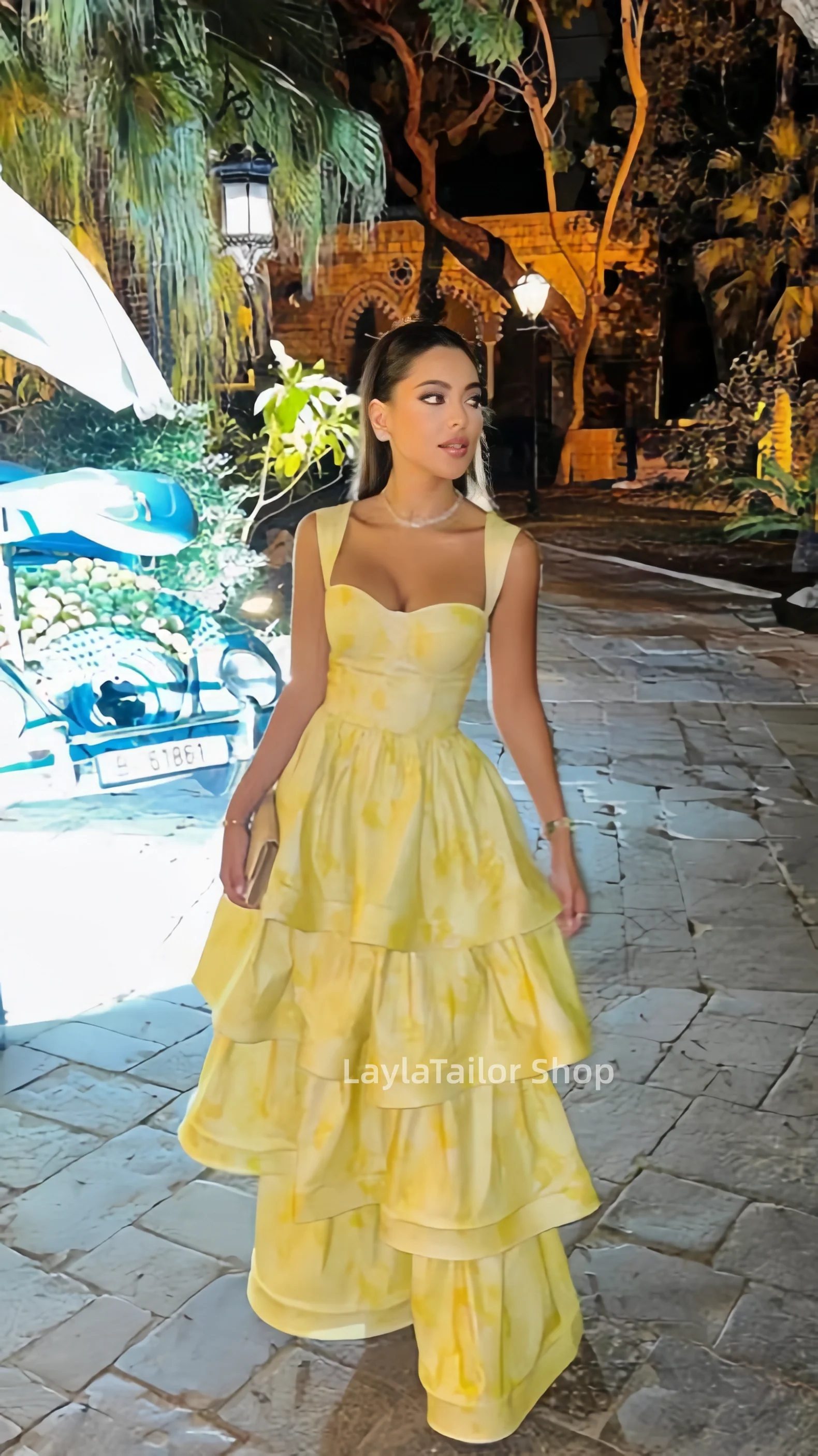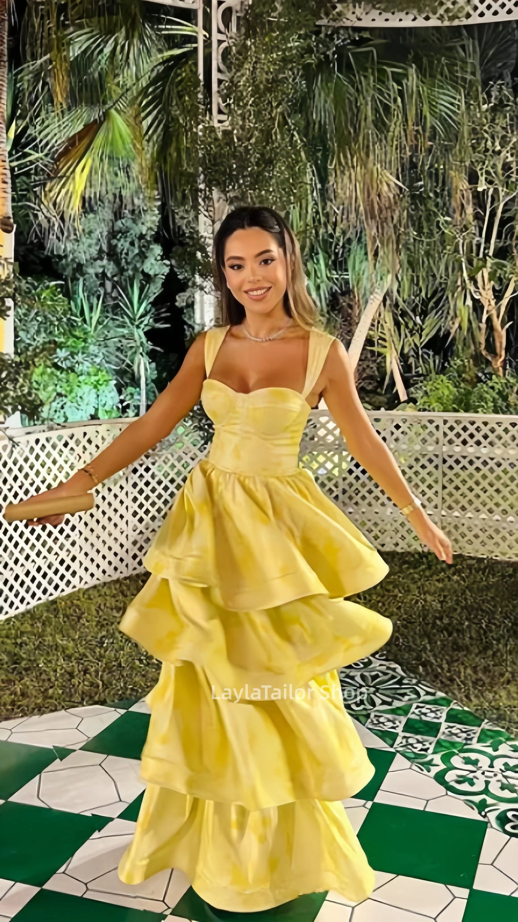 Vintage Pastel Yellow Floral Ruffle Tiered A-Line Long Party Dress Prom HZ0307