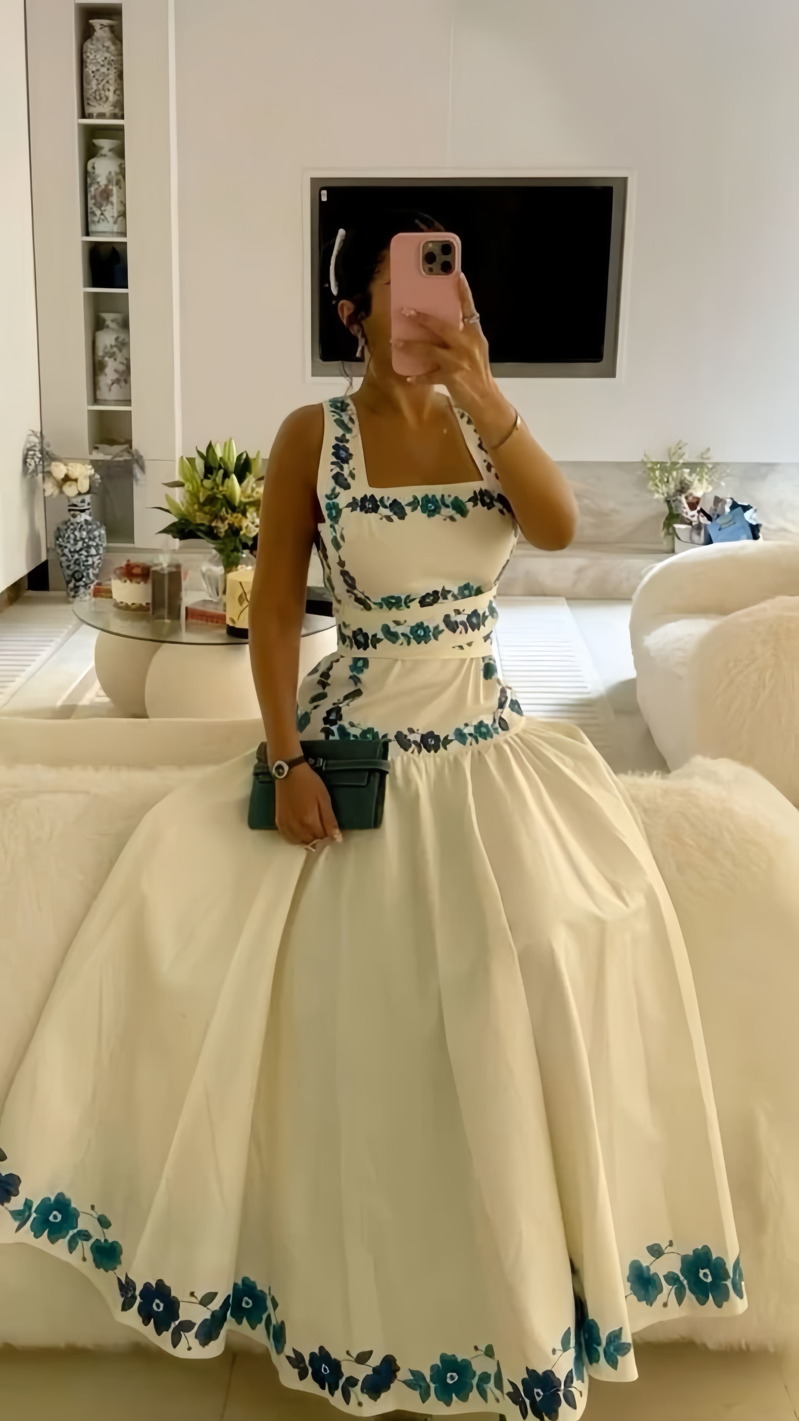 White A-Line Prom Dresses Floral Print Evening Party Dress Holiday HZ0307